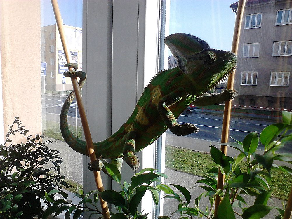 Lojzík dorostl na pořádného ještěra a když někdo vejde do místnosti, spěchá ke dvířkám, aby byl puštěn.