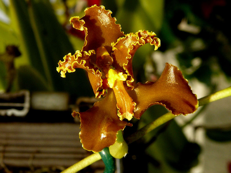Kytka prozatím s nejdelším čekáním na rozvinutí. Stvol začal vylézat počátkem června, rostl a rostl až dorostl do dvou metrů, pak se začal pozvolna rozvětvovat, takže vznikla řídce rozvětvená lata s cca asi 100 květy. Dnes se zcela rozvinul první. Blbě se fotí, protože v přeplněném skleníku manipulovat s kytkou s dvoumetrovým stvolem, který má v průměru cca 4mm není sranda a pod policemi to prostě bez úrazu neprotáhnu, tak alespoň takto.