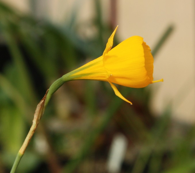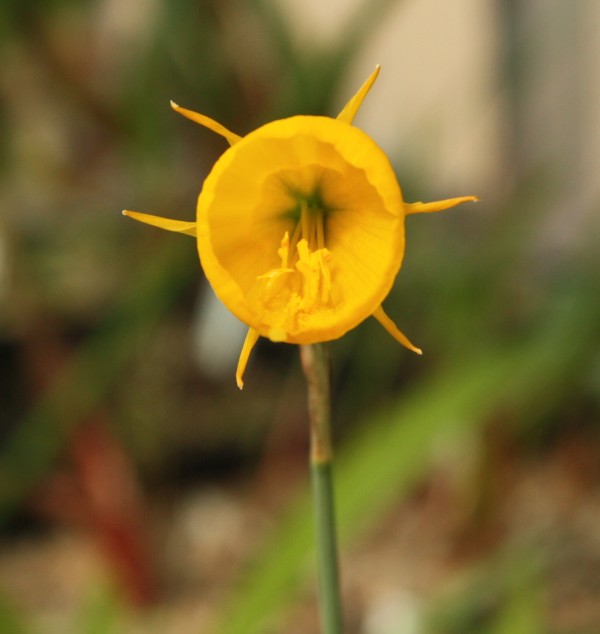 Z mediteránních cibulí vybírám dva (špatné) obrázky Narcissus bulbocodium, selekce (nebo hybrid?) Golden Bells. Patří do skupiny už zmíněných "spodničkových" zimních narcisů, roste dobře, ale kvete mi málo - příbuzné druhy N. cantabricus a N. romieuxii jsou u mne podstatně spolehlivější. T.