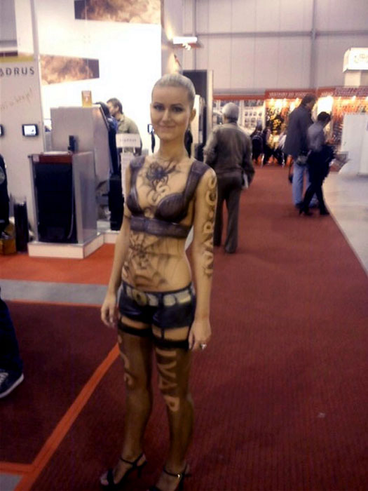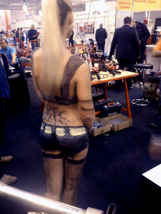 Malé odlehčení. Nejen na plátno se dá malovat a je to zajímavé. Takový malý návod pro tropické dny léta. Bohužel foceno jen telefonem. Bylo to zajímavé zpestření v jinak úmorných dnech vystavování na Aquathermu. A holky byly "oblečené" každý den jinak.