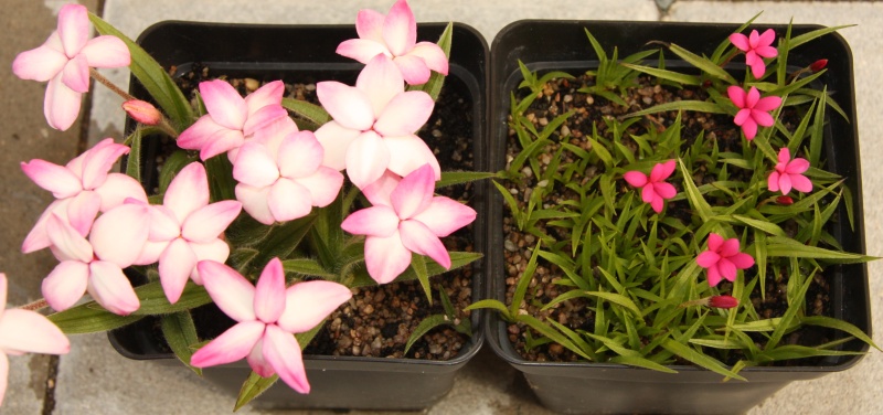 Tak už mi Tome taky začíná rozkvétat Rhodohypoxis, ale jaký druh nebo hybrid to je, netuším. Vždycky mi u něho takto zasychají konečky listů. Nijak mu to nevadí, ale vzhledné to taky moc není.