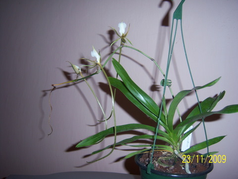 Ten, kdo navštívil výstavu v Drážďanech, viděl tuhle krásku s prehistorickým názvem (teda podle mě) na vlastní oči. Naprosto mě uchvátila a povedlo se mi ji tam zakoupit od Orchideen Kopf se začínajícím květním stvolem. Mám velkou radost, že vykvetla, přestože jedno poupě zaschlo.