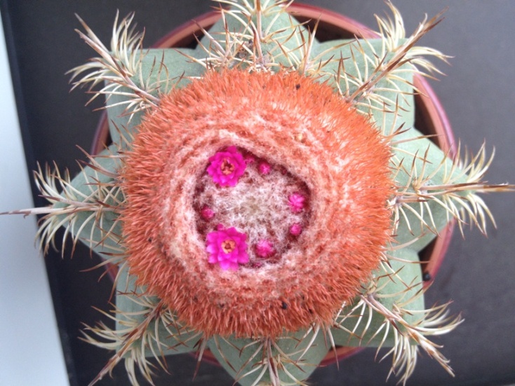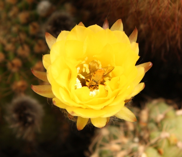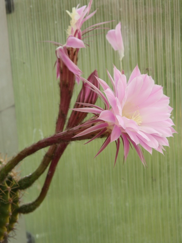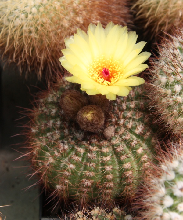 Jardo pěkný drobek. U mne kvetly ještě nějaké kakty, tak se zpožděním vkládám. Lobivia je snad famatimensis, ale nějaká vytrněnější forma; legendární Reicheocactus pseudoreicheanus moc nepřipomíná. Druhové určení parodií neřeším. Na echinopsisu je vidět, jak se slimák popasoval s jedním květem. T.
