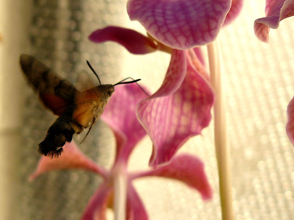 Dnes bylo nádherně a tak jsem měl skleník otevřený při zálivce. Najednou mi něco profrčelo okolo hlavy a hurá na rozkvetlou Vandu. Tak jsem si říkal " no holka máš to spočítaný, protože tě honit ven mezi kytkama nebudu" ale překvapila. Ladně navštívila vše co kvetlo a stejně ladně opět dveřmi vyplula ven.