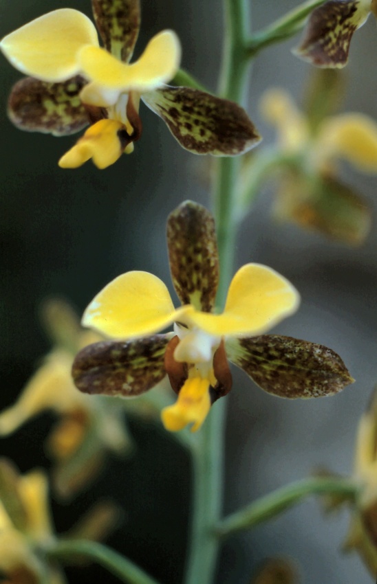 Tato orchidej rostla mezi kamením v pohoří Swatberg, směrem k městu Graaff-Reine (JAR), na velmi suchém místě v blízkosti velké tlustice (Crassula ovata, dříve portulacea). Byla to jediná rostlinka orchideje mezi jinými sukulenty a kamením v kopcovitém terénu. Lodyha je 50 cm vysoká, malé kvítky jsou žluto až nahnědle žíhané a tečkované (asi 1,5 cm).