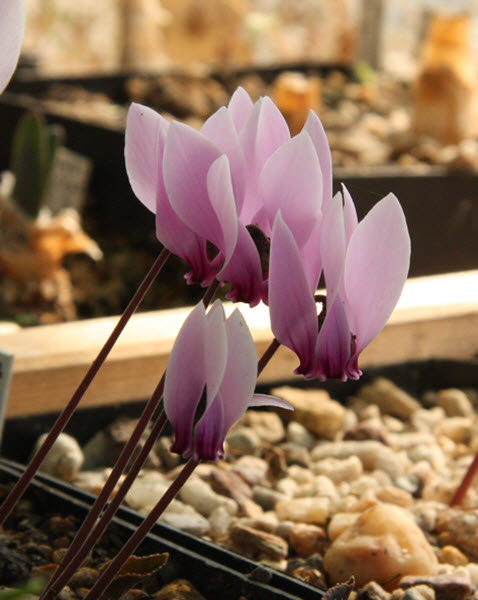 Zephyranthes candida už tu byl, takže došlo na to opakování  , ale letos se zase docela povedl, tak neodolám. V přírodě roste na obrovském areálu od Louisiany po Argentinu včetně (do té L. je zavlečený z jižnějších států Unie). Nejlíp vykvétá na podzim po předchozím mírném (!) prosušení přes červenec a srpen - listy by ale neměl ztratit, takže nějaká zálivka být musí. S nástupem chladných nocí a po pořádné zálivce synchronně vykvete většina cibulí v hrnku a podle mého názoru je to docela pěkný pohled. Kdysi jsem tu ukazoval fotku květu Cyclamen graecum a povzdechl si, že mám jen dva květy na jediné rostlině... Čas "oponou trhnul" a ta kytka pořádně zesílila a má asi patnáct květů; co je důležitější, má taky sestřičku, jejíž obrázek sem dávám. Sestřičku jsem "upytlačil" předloni na podzim v centru Atén na kopečku Filopapou kousek od Akropole; nad zem tam právě začaly vykukovat svazečky květů... Vybral jsem si jeden hodně chudý, zato krásně vybarvený, a propiskou jsem začal šťourat (byl jsem na historické procházce a že najdu bramboříky jsem vůbec nepředpokládal). Nakonec jsem vydoloval hlízu velkou jako pěkný pomeranč; vloni se aklimatizovala, takže květy žádné, ale letos už se činí. Nakonec tři obrázky "sukcese" ve skleníku, první dva pro srovnání. Začíná nejhezčí údobí roku, aspoň pro pěstitele rostlin z oblastí s mediteránním klimatem... T.