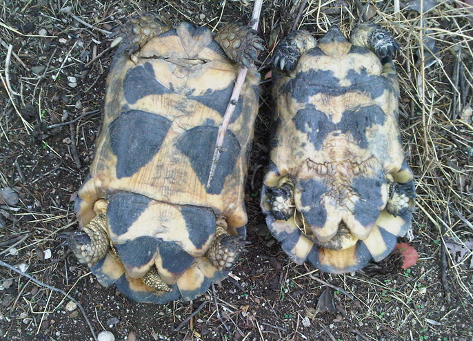Ještě k těm Aténám na podzim: dá se toho tam vidět moc a nejen, co se památek týká. Nejprve obrázek pěkného Cyclamen graecum, rostoucího na zmíněném kopečku Filopapou v díře uprostřed vápencového balvanu, potom neurčená Sternbergia, taky pěkně "zapasovaná" do škvíry ve vápenci, na archeologické lokalitě Areopagus na severozápadním okraji Akropole, a nakonec největší evropská suchozemská želva Testudo marginata opět na Filopapou. Ty želvy mi vyrazily dech - v hotelu jsem zaslechl kohosi povídat o želvách v parku, tak jsem tam vyrazil a hned na začátku jsem našel jezírko se zavlečenou severoamerickou Trachemys scripta elegans. Naprosto zklamaný jsem brouzdal dál parkem a zaslechl rány, jako když někdo bouchá kamenem o kámen - tohle už znám, třískáním krunýře o krunýř dává želví samec své vyvolené najevo, že bude sex  . Tak jsem šel po zvuku a našel tyhle želvy... pak během dvouhodinové procházky ještě asi deset dalších. Jsou těžce poznamenány "civilizací" (díry v krunýři, kousance od psů), ale zjevně nehodlají vymřít a Atény vyklidit. T.