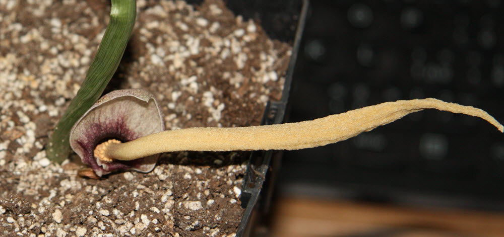 Zdenka, tak to mám radost, třeba už letos něco zakvete... Já bych dnes ukázal dva další zmijovce, Amorphophallus polyanthus a A. terrestris. Oba patří do skupiny asi šesti drobných druhů z východního Thajska a z Kampučie, vyznačujícících se k zemi přisedlým, nesmradlavým květenstvím a suchými plody (valná většina, ne-li všechny ostatní druhy, mají šťavnaté bobule). Kromě těchhle dvou pěstuju ze stejné skupiny ještě již zde představený A. obscurus, což je tedy mrcha náladová a mám velké problémy problémy udržet ho vůbec při životě. Tyhle dva se zdají být poněkud svolnější  . Oba kvetou na konci růstové sezóny, první jmenovaný většinou tvoří několik květenství rychle za sebou nebo i zároveň (viz druhové jméno!), druhý si zpravidla vystačí s květenstvím jediným. Na prvních třech obrázcích je A. polyanthus - spadix je asi 12 cm dlouhý, toulec má v průměru asi 2 cm. Je vidět i řapík právě uvadajícího listu. Na posledním snímku rozdvojující se hlíza A. terrestris se dvěma květními pupeny. Prý má vonět po banánech  , tak jsem zvědavý... Vloni, když kvetl poprvé, jsem ho moc neočuchával. Tenhle druh nemá zrovna v oblibě zimování tzv. "na sucho", tedy vyndaný ze zeminy v krabičce nebo v papírovém sáčku. Hlízy dost rychle sesychají; sice na jaře vyraší, ale trvá jim to dlouho a zbytečně je to vysiluje. Lepší je na podzim, po odpadnutí listu, vysypat hlízu z hrnku, udělat "inspekci"  (to u mne obnáší změření a zvážení hlízy) a hned zase zasadit do mírně vlhké, čerstvé zeminy. Potom až do jara je opatrně zalévám, jen tak, aby zemina nebyla na prach. Všechny tyhle druhy se vegetativně množí postupným dělením hlízy a to dost pomalu, semena se mi získat nepodařilo. T.