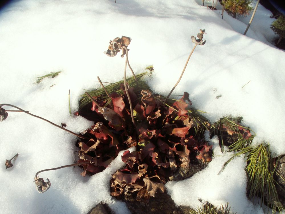 Saracenie naprosto v pohodě zvládají i holomrazy, pod sněhem jim je taky dobře, ale jak to jde, už se cpou na Slunce. Na fotce je vidět klestí z borovice , byla po ruce a přikryla se s ní psitacina.