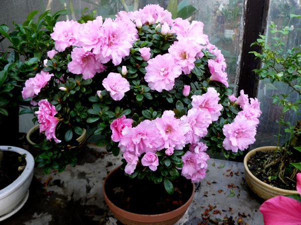 Kvetoucí bonsaje a zazimované Mandevily.