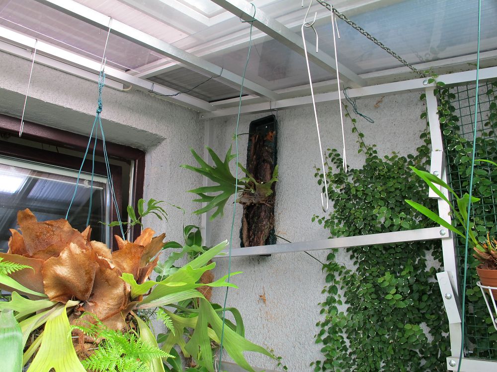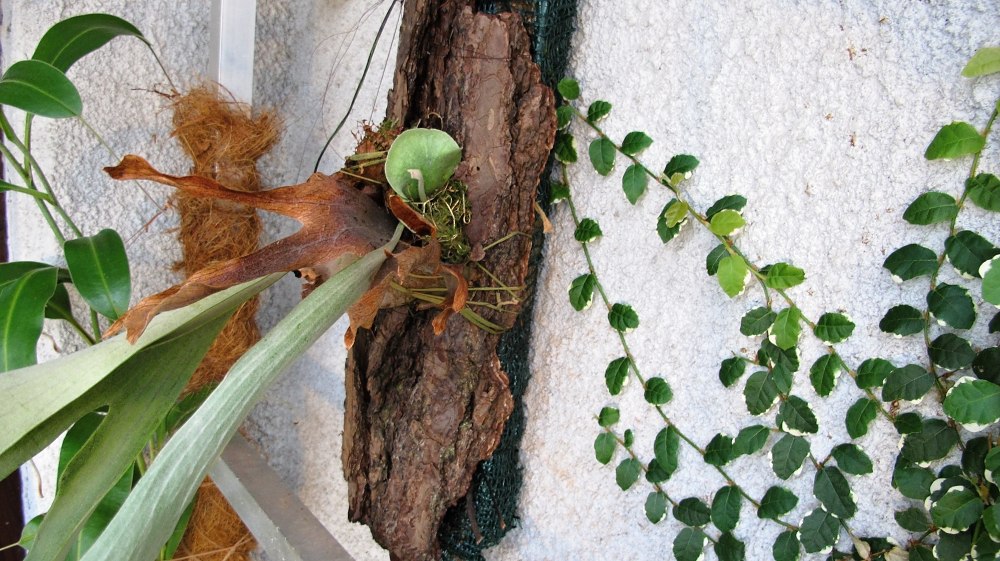 Tak Paphio už je tam .Je to ta vaše parožnatka která byla u Cymbidiella pardalina.Je tam nízký tácek + trocha substrát zajištěn aby nevypadával+ kapradina má rhizom který se mě plazí v zz bez substrátu a roste dobře.Tak třeba tam na tý stěně zdivočí a to bych chtěla.Parožnatka zatím neprotestuje.