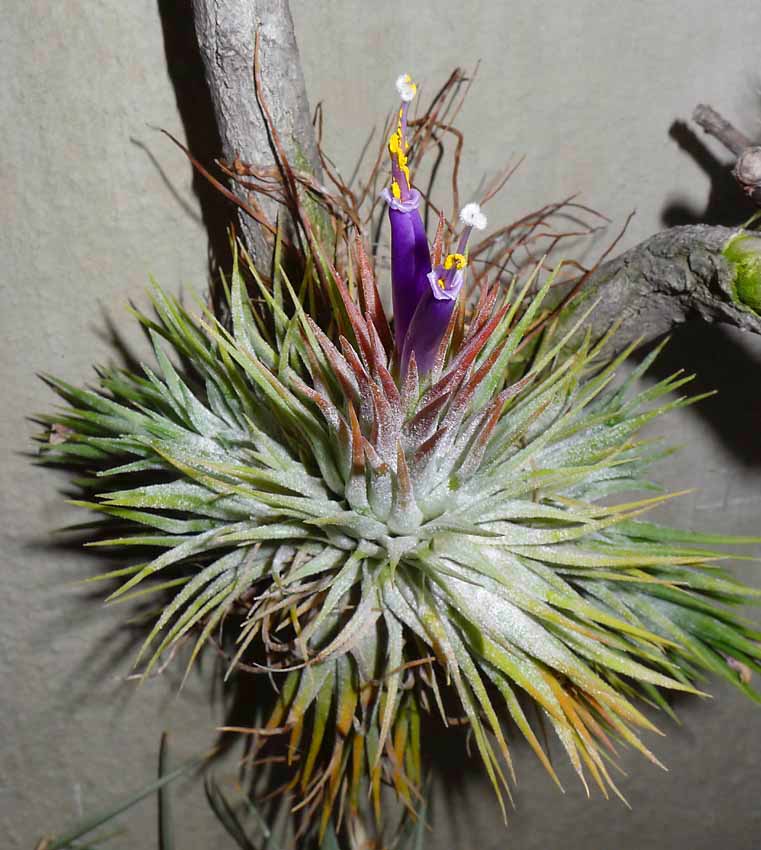 pafka píše: zaruba píše: Tak jsem zjistil, že mi dokvétá také T. tectorum. Mám ale u ní poznačeno, že je to miniforma. Pak mám ještě robusní formu, ta ale kvete na jaře. Jak je vidět je to dosti variabilní druh. Více než květenství mne ale zaujalo to, že původně přilepená rostlina přikořenila neoddělitelně k větvičce plochými kořeny podobně jako třeba břečťan. Asi vytušila, že to lepidlo ji neudrží na věky  Kvetla mi v květnu a i když se to nezdá má 30 cm v průměru, mám ještě jednu tuto velkou formu, ale na květ je ještě malá. Původně jsem si pořizovala tři kousky, všechny byly přilepené. Tu kvetoucí a tu menší jsem odlepila a nechala volně ve vitríně a přirostly k podkladu, pro přemístění na větev jsem je musela odtrhnout, no a ta třetí zůstala přilepená a ta odumřela, proto nemá k lepení kytek důvěru, ale je to o zkušenosti, já mám špatnou tak raději vše vážu Jistě, je to o těch zkušenostech. Mám přilepené kde co a nikdy jsem nezjistil že by rostlina odkráčela od toho lepení. Tillandsií zdechlo minimum. Myslím že oba způsoby jsou dobré. Vyvazování je asi přirozenější, lepení estetičtější.