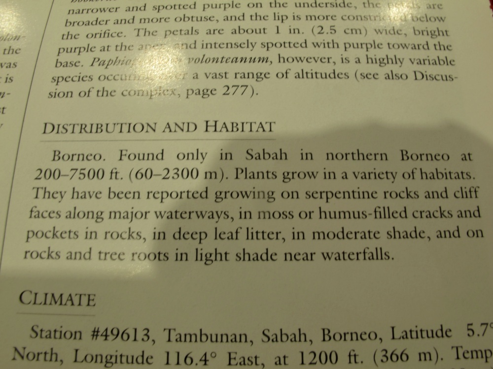 Mám publikaci Braem "The Genus Paphiopedilum" Musím přiznat po kouknutí sem http://www.orchidspecies.com/paphvoluteanum.htm a sem http://www.slipperorchids.info/paphdatasheets/sigmatopetalum/hookeraevarvolonteanum/index.html jsem zaváhala jak to vlastně je .Ale i přepočet je správně 200stop(ft) je 60.96 metrů. Tak asi je někde chyba jedno je jistý že i na 600m snad roste.Pak věř informacím na netu .O to záhadnější může být pěstování nebo lehčí , nemůžu to za takovou chvilku pěstování posoudit. Tohle je z publikace-příloha .
