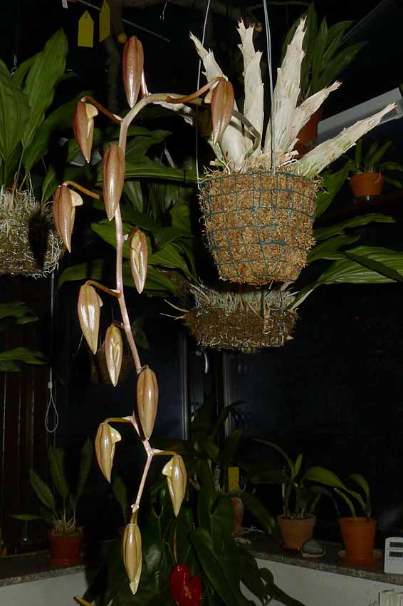 Už lezou poupata i na Coelogyne dayana. Stvoly se sice již docela rozeběhly, ale snad to alespoň den pokvete naráz.