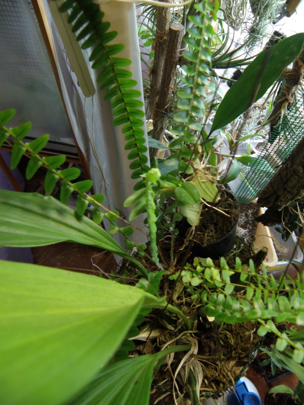 Ale zpět k Stanhopea shuttleworthii.....získal jsem od Aleše opravdu rozrostlou rostlinu, velmi letitou o počtu asi 8-9 pahlíz, která je usazena v poměrně hlubokém drátěném košíku, přesto si našlo květenství cestu ven bokem. Současně s touto orchidejí je zasazeno, či spíše spontálně vyrostlo i kapradí jménem Nephrolepis cordifolia (touto cestou musím poděkovat váženému panu řediteli Botanické zahrady v Liberci- p. RNDr. Studničkovi za její bližší určení), které tvoří svými dlouhými jemnými zpeřenými listy společně s orchidejí velmi svěží kombinaci zeleného zátiší.
