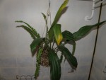 Ale zpět k Stanhopea shuttleworthii.....získal jsem od Aleše opravdu rozrostlou rostlinu, velmi letitou o počtu asi 8-9 pahlíz, která je usazena v poměrně hlubokém drátěném košíku, přesto si našlo květenství cestu ven bokem. Současně s touto orchidejí je zasazeno, či spíše spontálně vyrostlo i kapradí jménem Nephrolepis cordifolia (touto cestou musím poděkovat váženému panu řediteli Botanické zahrady v Liberci- p. RNDr. Studničkovi za její bližší určení), které tvoří svými dlouhými jemnými zpeřenými listy společně s orchidejí velmi svěží kombinaci zeleného zátiší.