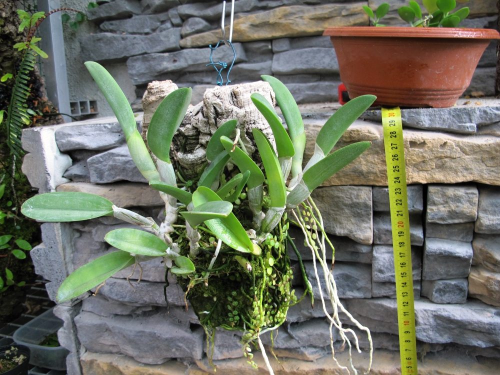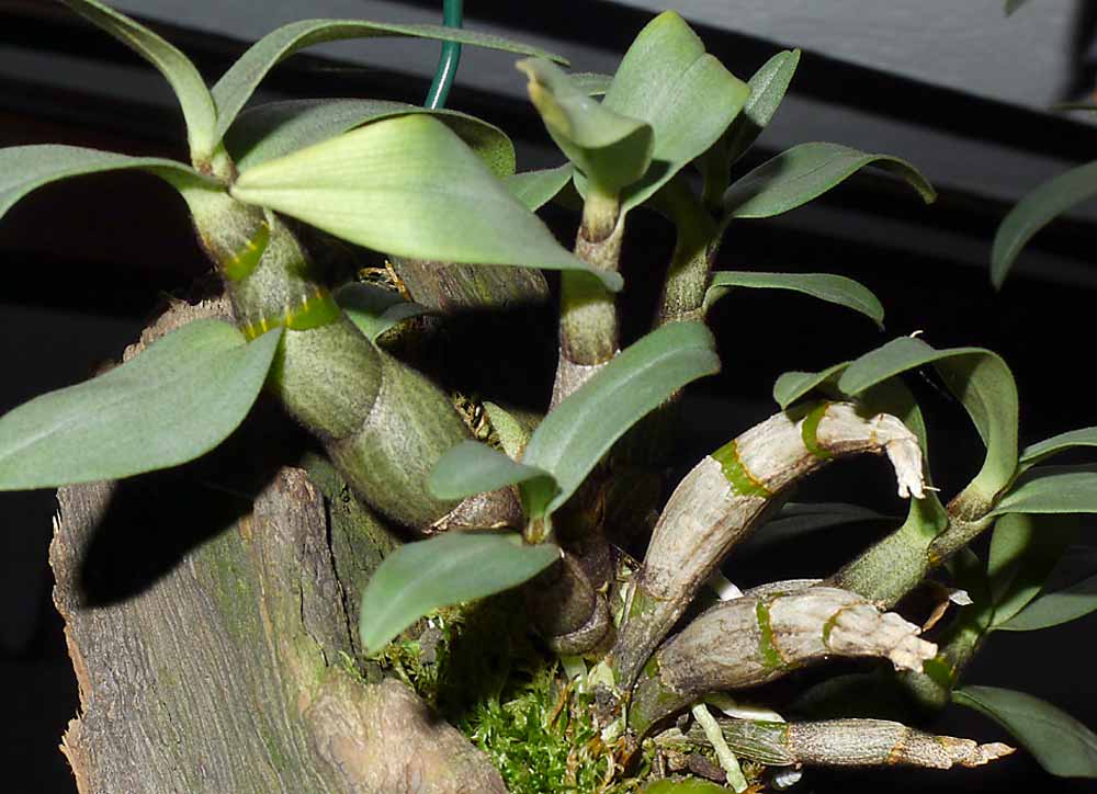 Chtěl bych tu zmínit jednu svou zkušenost. Některé druhy orchidejí rostou nejlépe vyvázané na kůře ať pěstitel zkouší cokoli jiného. Snažil jsem se po dva roky pěstovat miniaturní druh Dendrobium bellatulum v malém keramickém květináči v piniové kůře stejně tak jako některé choulostivé druhy orchidejí. Malý květináček rychle proschne a kořínky se mohou klidně plazit po kouscích piniové kůry. Rostlina ale přes veškerou péči nepřirůstala uspokojivě a ani nekvetla. Nakonec jsem se letos brzy z jara rozhodl přilepit tento druh na kůru do takové praskliny kam jsem dal i trochu mechu. Člověk by se domníval, že se téměř nic nezmění, protože režim zálivek a proschnutí bude v obou případech podobný. Nedávno mě ale překvapilo, jak veliké a silné jsou letošní pahlízy a to ještě neskončil jejich vývoj. Přikládám snímek na kterém je patrný rozdíl velikosti loňských a předloňských pahlíz a té ještě nedorostlé letošní. Podobné je to i u malých rostlin Psychoušů, které v květináčích nevydržely ale na kůře přirůstají. Dospělé rostliny Psychoušů ale rostou v mističkách s piniovkou Ok. U některých druhů je prostě kůra nejlepší pěstební podložkou a nemá cenu zkoušet jejich kulturu v nádobách.