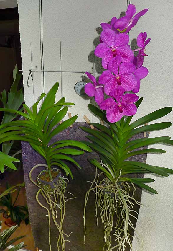 Ono to funguje i bez substrátu. Vanda suavis byla už přes dva metry a ohýbala se o horní sklo ale cca metr od vrcholu vyrazila dva kořeny, takže jsem tem metr vrcholu uřízl. Každý týden jsem ji jen těmi kořeny namočil na cca půl hodiny a nerosil. Musel jsem vylomit rašící tři květné výhony, protože jen se dvěma kořeny byť cca 1cm tlustými se zdála slabá. Takto jsem ji měl na drátě pověšenou měsíc, než dorazil zájemce. Když jsem mu Vandu předával, tak jsme zjistili, že razí další květný stvol. Stávající zbytek Vandy u řezu vyrazil tři rostliny, takže vrchol je teď trojitý u květináče má další malou rostlinu, která pouští kořeny a budu ji muset oddělit. V každém případě při rosení na list trpívá flekatěním listů.