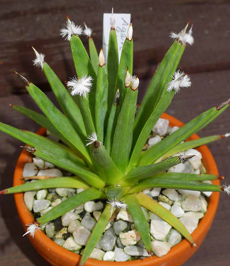 Agave albopilosa má asi 8cm v průměru a začíná to vypadat, že bude štětičky otevírat i v kultuře. Zatím jsou ale rostliny stále mladé takže nic moc.