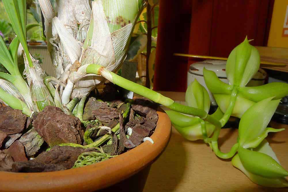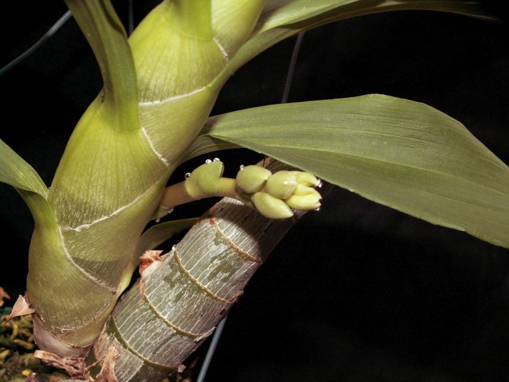 Ony ty kytky občas blbnou a kříženci zvláště. Nemyslím, že by ten kořen měl nějaký podstatný výživový význam pro rostlinu nebo snad stvol. Mě jak nyní kvete to Catasetum pileatum "Green-gold" tak si pustilo kořen také a už zarostl do substrátu. Je to ale poprvé co se mi to objevilo. Ty "výpotky" to je sladká medovice( nektar), kterou rostlina v předstihu láká opylovače aby se tam naučily létat než rozkvetou květy. Občas si ji olíznu z prstu i já