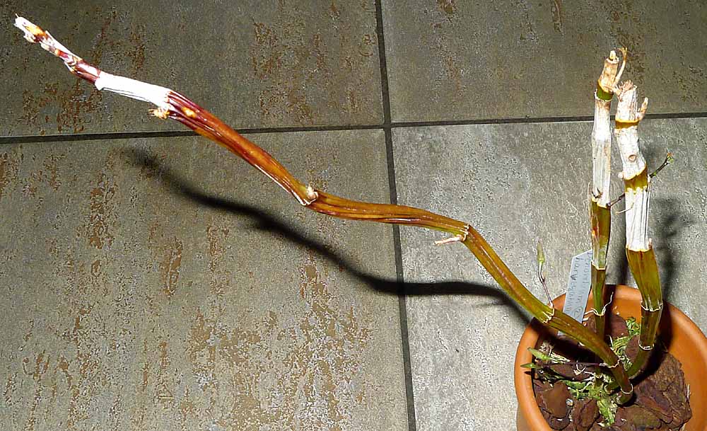 Tak jsem to dnes vyfotil. Máte pravdu nic nedělá, listy opadly asi tím průvanem z ventilátoru. Kytka se jich asi zbavila ať neodpařují zbytečně vodu. A s novým výhonem nevím, mi ho vypouští někdy v srpnu. Uvidíme, co letos.