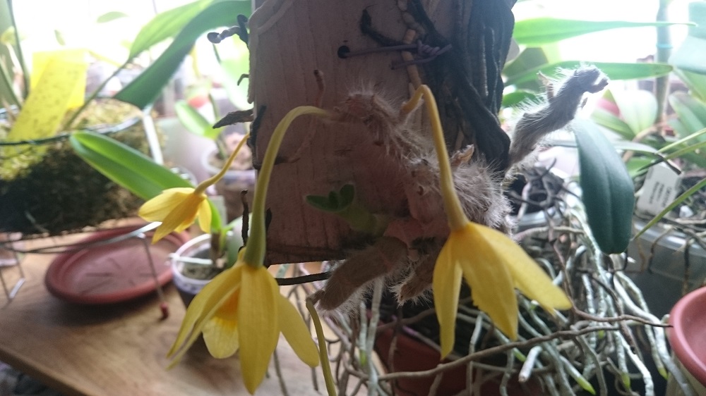 vizir píše: Zdá se,že kytka se rozhodla zahodit květy a začít období růstu.Celkem mě to překvapuje,v minulosti mezi ukončením kvetení a růstem byla vždy pauza.Možná na tom mám i svůj podíl viny.Rostlina se mi zdála seschlá více než v minulosti,tak jsem několikrát porosil kořeny.Myslím ale,že na kulturu to nebude mít vcelku žádný vliv,protože svítím.Na podzim ukončím zálivku stejně až po vyzrání pahlíz i kdyby pahlízy narostly i v druhé vlně. Mně již také kvete. Koupil jsem si v Drážďanech druhou rostlinu a byl na ní květ  . Přilepil jsem ji na borovou kůru abych se dvěma rostlinami mohl experimentovat na více frontách. Nyní mi začíná nasazovat D. parishii ze stejné oblasti. To jsem ale měl celou zimu tepleji v ZZ a bez svícení. To senile bylo v kakt. skleníku při o něco nižší teplotě, takže trochu nějaký skluz může mít. Stále doufám. Jak jsem podruhé porosil tak zase přestalo opadávat. Ta reakce je pořád stejná. Za 6 měsíců 2x rosa a tři měsíce z toho nad radiátorem UV. Asi je to spíše test toho co kytka vydrží než stanovení optimálních podmínek