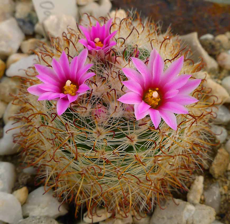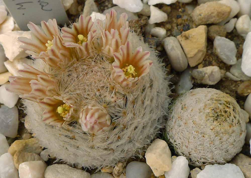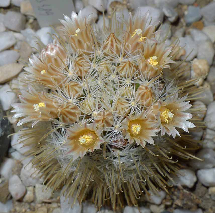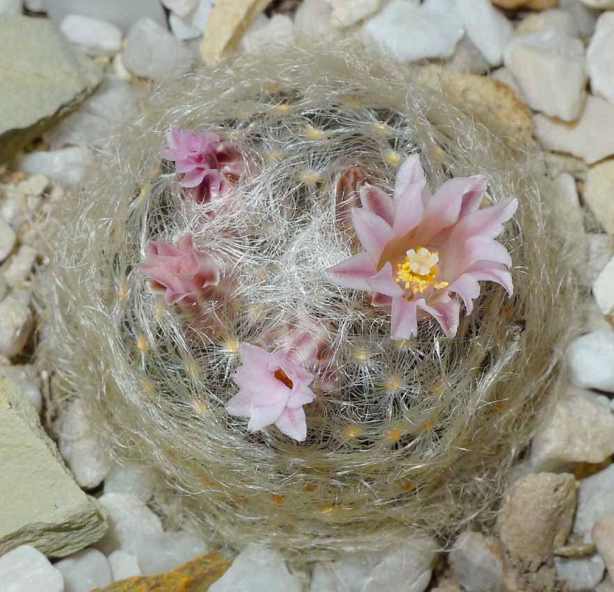 Mamillaria senilis, klasický a žlutě kvetoucí forma. Dříve obrovská vzácnost kterou nikdo neudržel dlouhodobě ve sbírce, dnes se její kultivace daří i jako pravokořenná. Pochází z Mex. nadm. výšky až 3500m, kde je v zimě až -10°C a téměř metr sněhu!
