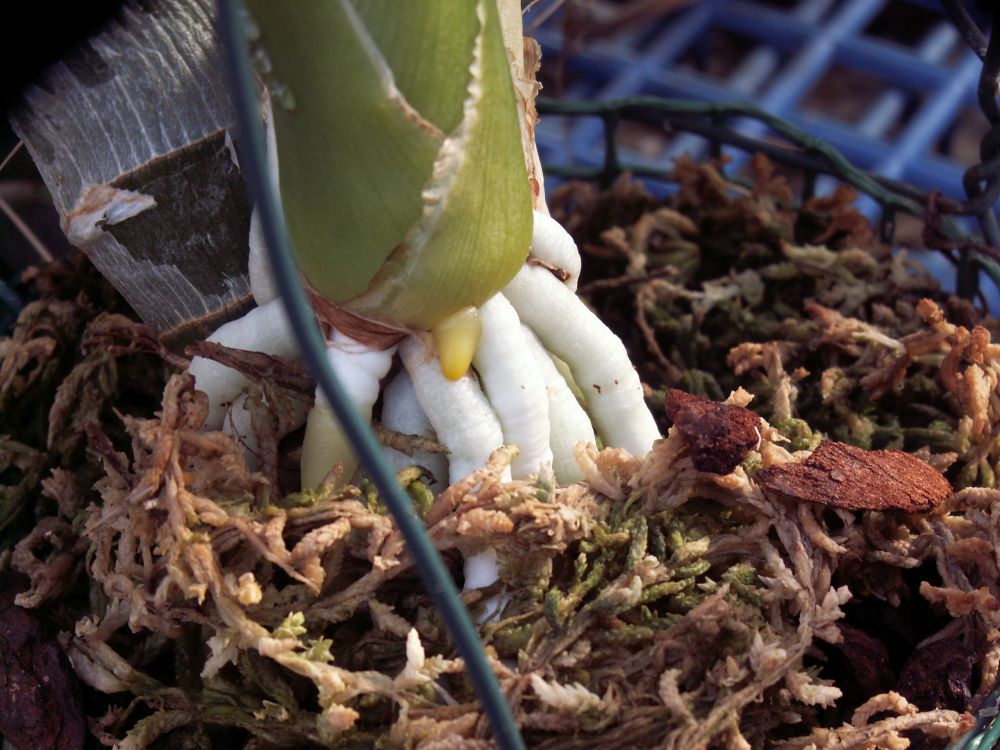 Cycnodes se dal do nezadržitelného růstu, stará pahlíza je plně olistěná, ale vevnitř se to nějak scvrklo. Tak jsem to namočil, ale jen do poloviny. Za tím novým výhonem je kořen co rostl na květním stvolu.