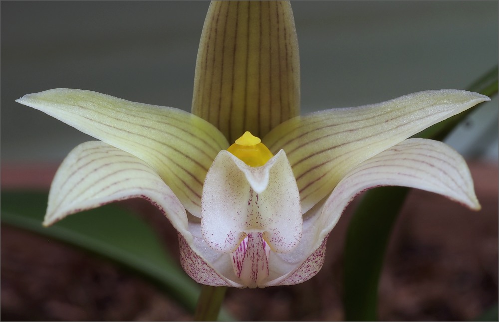 Dneska vykvetlo,je to vlastně moje první botanika,koupeno v lednu u Lukse... Na detailu dole je vidět,proč je labium pohyblivé-zúžená stopka,na které je uchyceno (původně jsem myslel,že tam má kloub...  )