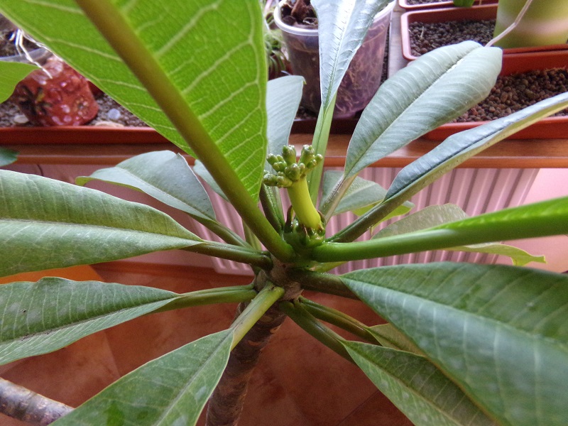 Mě se asi rozhodla jít do květu Plumeria rubra. Normálně kvete asi v létě? Co s tím, jaké máte zkušenosti, nechat vykvést, nebo vyštípnout? Přisunul jsem kytku blíž k osvětlení orchidejí, tak něco dostává bokem taky. Asi to nechám dojít, v nejhorším případě květenství upadne  .