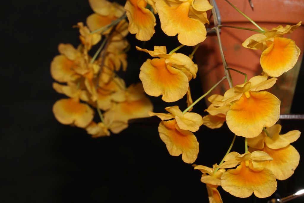 Pár kytek z asi 15 co kvetou právě teď. Dendr. aggregatum jsem navázal před 8 lety na korek s představou žlutého vodopádu.  Ať jsem se snažil jak chtěl, nekvetlo a nekvetlo. Strhal jsem to z korku dole a naplnil jsem 5 květináčů . Všechny pokvetou a toto je první z nich. Další mají nejméně 14 dní zpoždění.