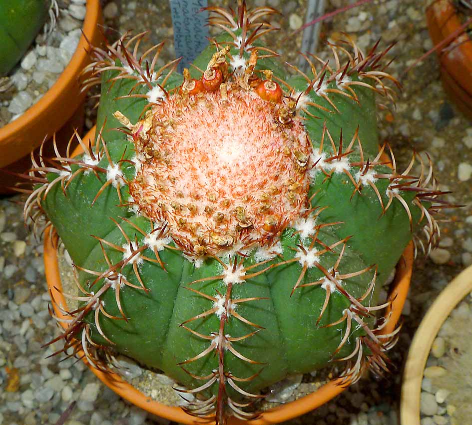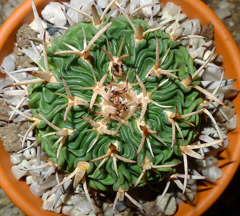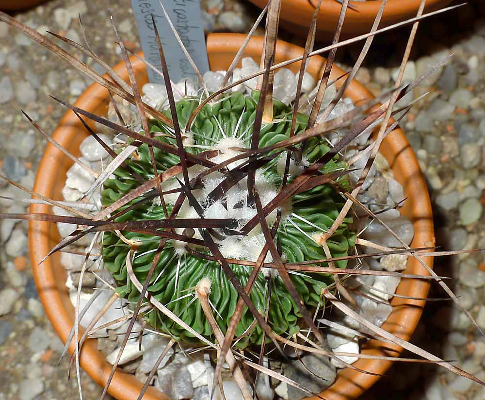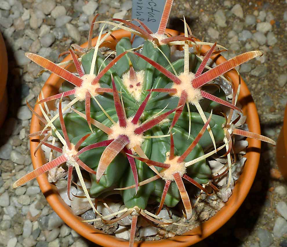 -Ferocactus latispinus, je hezký silným a barevným otrněním. Kačdý vroubek na středových trnech je denní přírustek trnu.