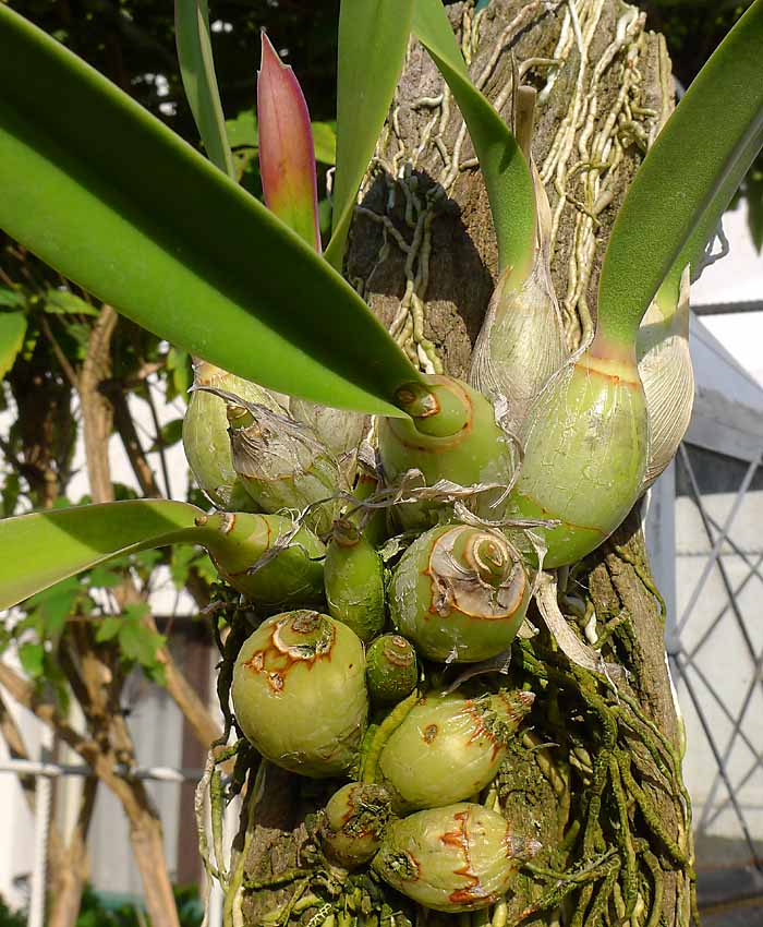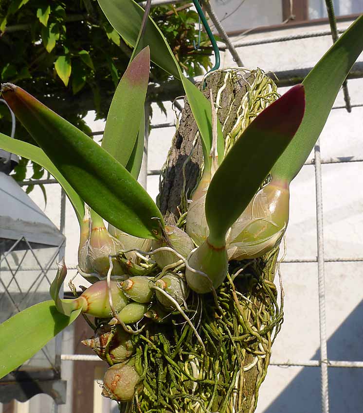 Měl jsem na to teorii, že brzy na jaře kdy je nedostatek světla a list se tvoří od špičky tak naroste slabé pletivo které po sléze nedokáže vyzrát a tak je náchylné k poškození sluncem a proto se brání fialověním. Také někdy poté zežloutne-když se neubrání. Druhá půlka listu, tedy od půli k řapíku roste v období březen-duben kdy je již světla dosti tak tyto problémy nikdy nemá. V přírodě má tento druh i v zimě stejně světla jako u nás v létě. U mě mají rostliny v zimě cca 3000lx ze zářivky 2700°K. 3000lx je snad popálit nemůže. Aby to bylo ještě zamotanější tak Dendrobium senile které přisvěcuji 30000lx 4000°K tak je úplně v pohodě a nic se na něm nepřipaluje. A aby to bylo ještě zamotanější tak mi to fialovění konců dělá i speciosa která mi přišla na konci léta od Elsner a naopak to nedělá ten největší trs L. speciosy co kvetl 6ti květy. Ostatní příbuzné druhy mi to také nedělají ani Laelia anceps, autumnalis i gouldiana jsou ok. Přitom hnojené jsou přibližně stejně. A teď "babo raď "