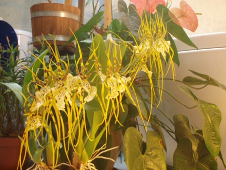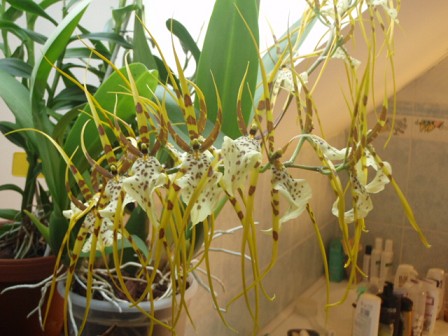 Letos mi předvedla Brassia rex dokonce dva květní výhony, pod střešním oknem v koupelně se jí moc líbí