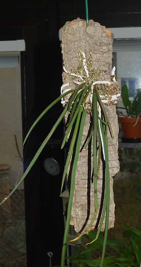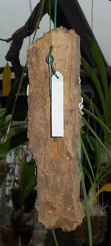 S přesazováním rostlin na kůrách je někdy problém. Nyní jsem potřeboval zvětšit podložky pro své oblíbené miniaturní trsy Dendrobium bellatulum. Pokud se hodně poškodí staré kořeny tak trvá minimálně rok než se z takového zásahu kytka vzpamatuje a přikoření k nové podložce. Abych tento rok zakořeňování rostliny ušetřil, provádím to takto. Ostrým nožem z kůry odloupnu několik vrstev i s rostlinou s nepoškozenými kořeny. Na větší podkladní kůře nebo korku si upravím plochu a pak těchto několik vrstev s rostlinou přilepím chemoprénem k většímu podkladu a zafixuji gumičkou. Po několika hodinách gumičku sundám a je přesazeno. Mezi kůrami kde není lepidlo vzniknou různé mezery kde se drží voda a rostlina rychle přikoření k novému většímu podkladu a kořeny vyplní mezery mezi oběma podklady. Někdy mezi kůry přidám trochu mechu. Takto bez poškození kořenů se dá přesazovat kdykoli i když rostliny nasazují na květ, což byl i můj případ. Ta trocha námahy se určitě vyplatí než čekat rok než rostlina dobuduje značně poškozený kořenový systém.