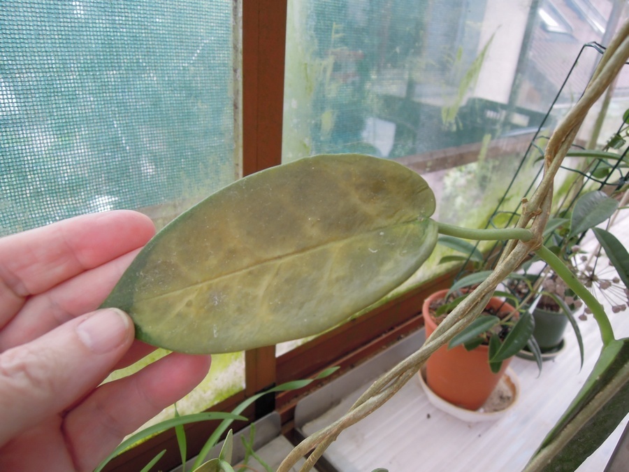 Moje blbost nezná mezí, včera jsem sundala stíník a vůbec jsem neuvažovala, že by i v září mohlo dojít k takové kalamitě. H. macgilivreyi je omotána okolo sítě na tillandsie pod střechou z makrolonu, tam listy vydržely, ale ze předu je sklo. Všechny listy, co byly ke slunci, spálené. A to tady byl opar. Ostatní voskovky, kromě této a H. greenii jsou již dole, tyto mají na květ, nechtěla jsem s nimi hýbat. A je to.