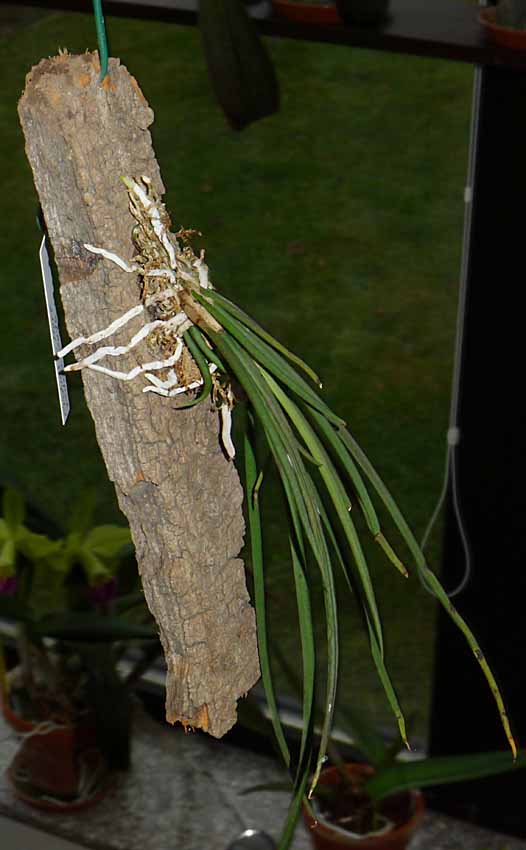 S přesazováním rostlin na kůrách je někdy problém. Nyní jsem potřeboval zvětšit podložky pro své oblíbené miniaturní trsy Dendrobium bellatulum. Pokud se hodně poškodí staré kořeny tak trvá minimálně rok než se z takového zásahu kytka vzpamatuje a přikoření k nové podložce. Abych tento rok zakořeňování rostliny ušetřil, provádím to takto. Ostrým nožem z kůry odloupnu několik vrstev i s rostlinou s nepoškozenými kořeny. Na větší podkladní kůře nebo korku si upravím plochu a pak těchto několik vrstev s rostlinou přilepím chemoprénem k většímu podkladu a zafixuji gumičkou. Po několika hodinách gumičku sundám a je přesazeno. Mezi kůrami kde není lepidlo vzniknou různé mezery kde se drží voda a rostlina rychle přikoření k novému většímu podkladu a kořeny vyplní mezery mezi oběma podklady. Někdy mezi kůry přidám trochu mechu. Takto bez poškození kořenů se dá přesazovat kdykoli i když rostliny nasazují na květ, což byl i můj případ. Ta trocha námahy se určitě vyplatí než čekat rok než rostlina dobuduje značně poškozený kořenový systém.