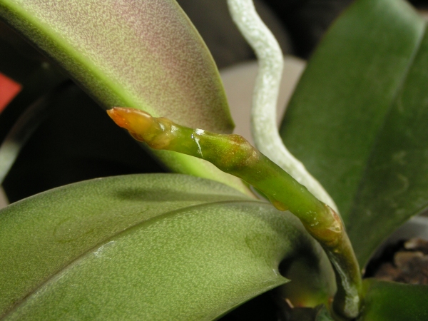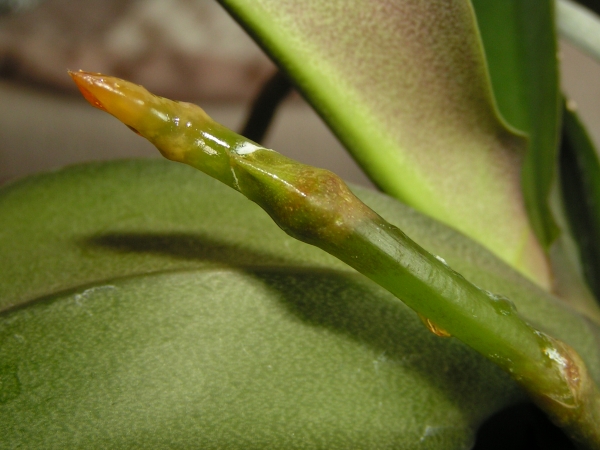 Na orchideji Phalaenopsis se mi objevují lepivé kapky na květním výhonu.