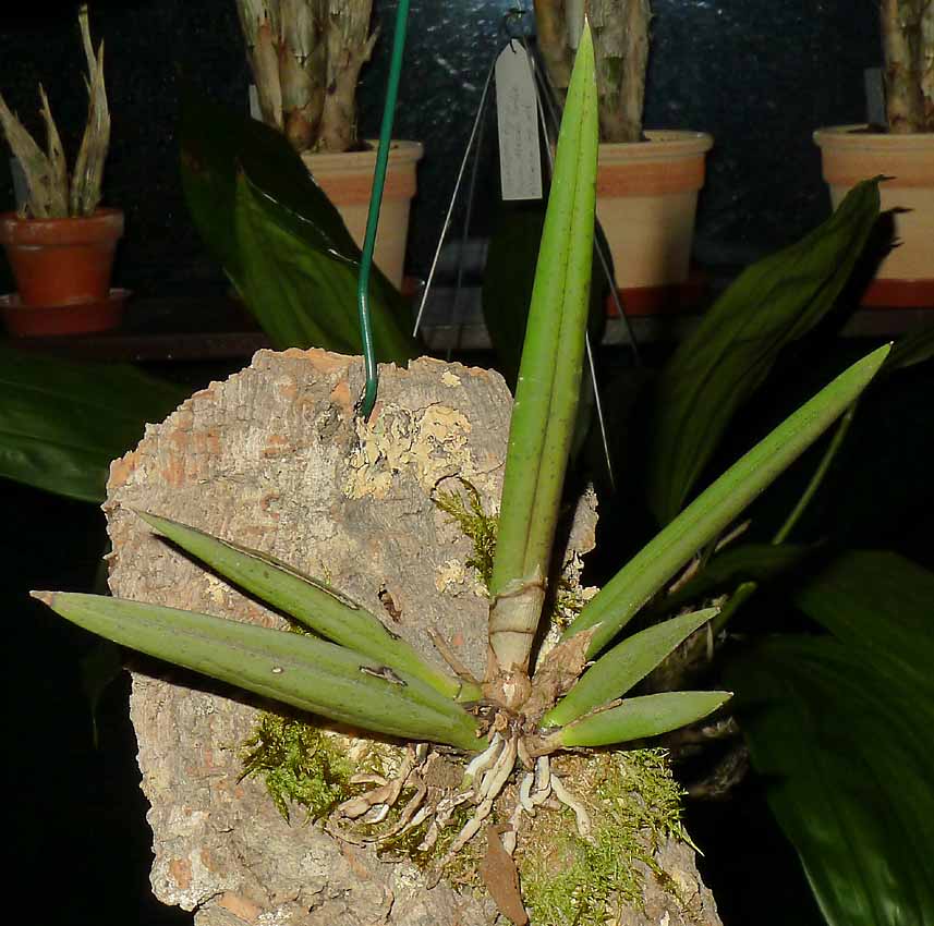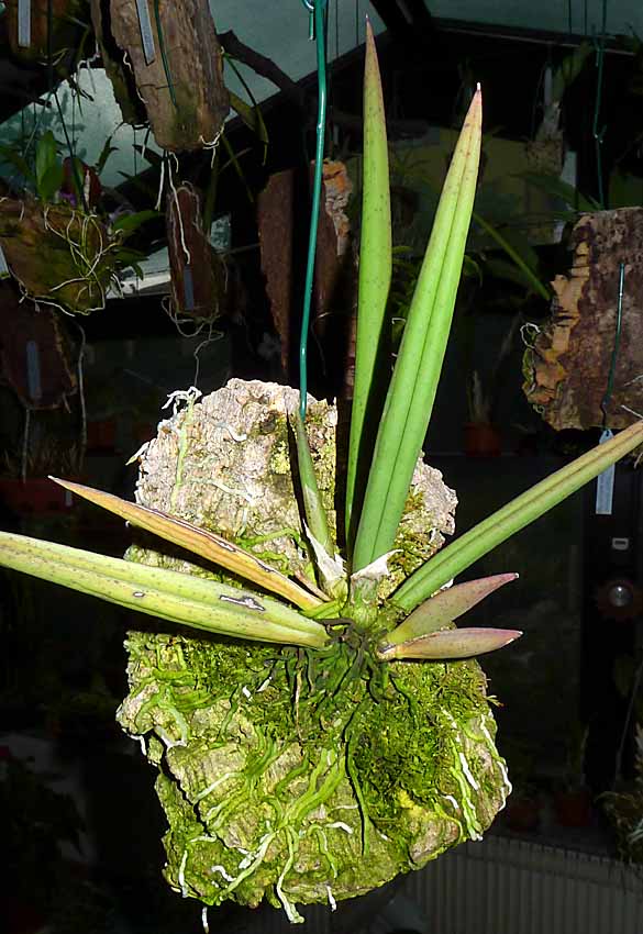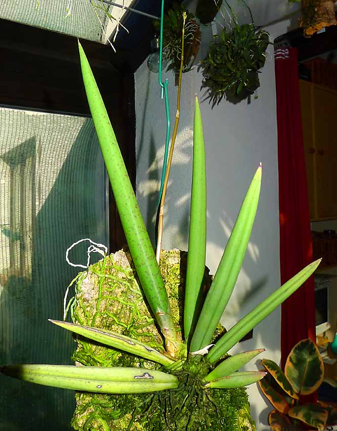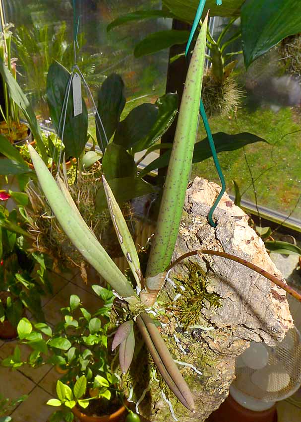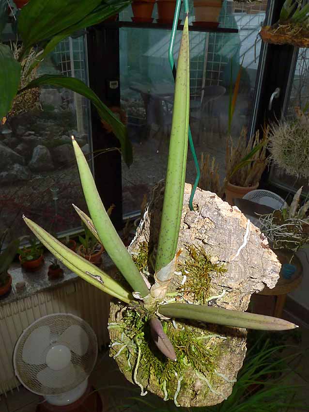 Pan T. má spíše můj obdiv že ta rostlina stále žije. Já jsem si myslel, že již bude na kompostu. Na jmenovce měl poznačeno, že ji má od Vás od r. 2014 tuším že květen. Měl ji tedy téměř 4 roky. S tím světlem budete mít asi pravdu, protože říkal, že loni se mu ulomil list, když rostlina byla šikmo na kůře a že to mohlo býti nedostatkem světla. Proto ji přesadil do ker. květináče do kůry aby listy vyrůstaly svisle. Včera ji měl v bytě na okně mezi ostatními orchidejemi. Takhle asi byla do doby kdy letní do nevytápěného skleníku. Bydlí na Faře takže okna obrovská tam zrovna nejsou. Kytce nyní dávám maximální péči a dále rozhodne vyšší moc. Pokud by se mi podařilo že by kvetla tak bych dal vědět a pokusil bych se ji s Vašimi radami sprášit asi s tou druhou skoroceboletou. Nikdy jsem ale nic podobného nedělal, takže bych je možná přivezl k Vám na sprášení, pokud by to nevadilo. Ta kytka je skutečně excelentní a zasloužila by si nějak se udržet ve sbírkách.