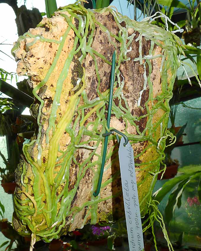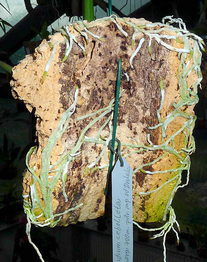 Oncidium cebolleta patří mezi "hodné" druhy kterým kořeny rostou po kůře a netrčí do prostoru na všechny strany.