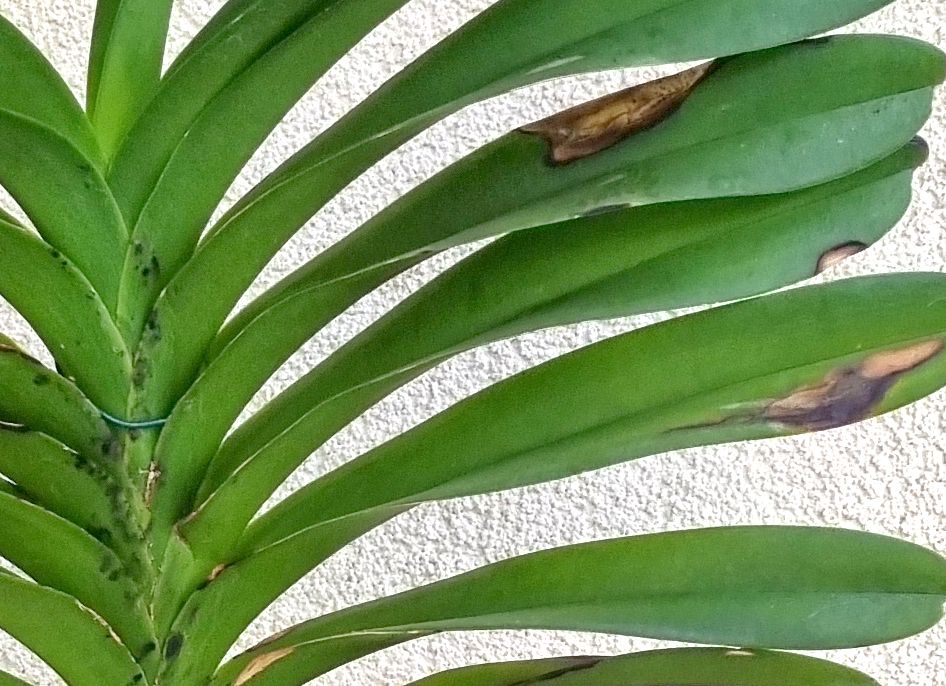 Na listech se objevují hnědé (hnilobné??) fleky a v paždí listů černé fleky. Na fotkách je to celkem pěkně vidět.