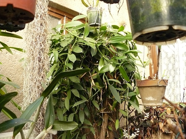 Tak letos se nejvíce zbláznila Vanilka. Už má nasazeno 7 květných stvolů kde na jednom bývá 10-20 květů. Ještě jsem ji neprolezl celou, takže toho může být víc ale nafotit se všechny nedají tak alespoň čtyři. Už je to pořádný obr, který za rok narostl u dvou výhonů každý o 6 metrů. Ani Angraecum se nedá zahanbit.