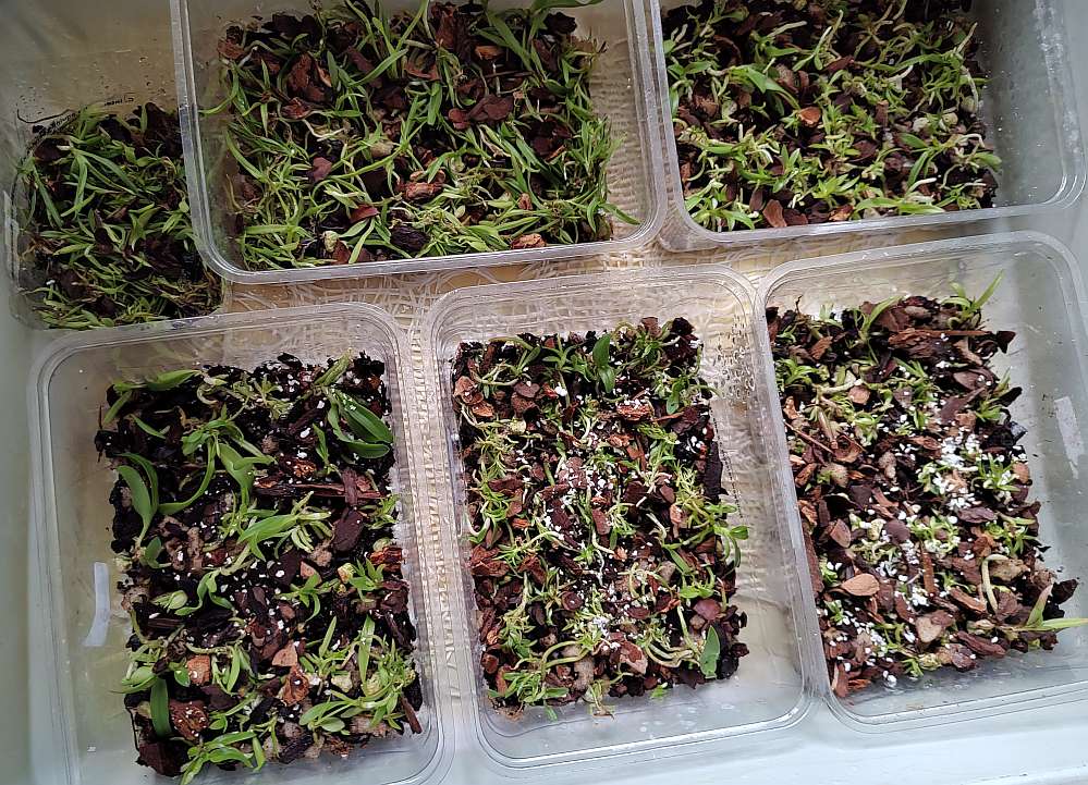 Na obrázku semenáče C&spol. rok po vylahvení a 3 týdny po vylahvení, Rostliny asi netuší, že neměřím pH, a proto se jim daří.