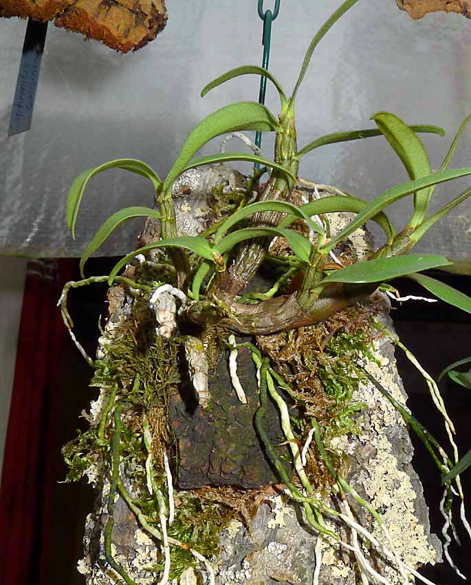 S přesazováním rostlin na kůrách je někdy problém. Nyní jsem potřeboval zvětšit podložky pro své oblíbené miniaturní trsy Dendrobium bellatulum. Pokud se hodně poškodí staré kořeny tak trvá minimálně rok než se z takového zásahu kytka vzpamatuje a přikoření k nové podložce. Abych tento rok zakořeňování rostliny ušetřil, provádím to takto. Ostrým nožem z kůry odloupnu několik vrstev i s rostlinou s nepoškozenými kořeny. Na větší podkladní kůře nebo korku si upravím plochu a pak těchto několik vrstev s rostlinou přilepím chemoprénem k většímu podkladu a zafixuji gumičkou. Po několika hodinách gumičku sundám a je přesazeno. Mezi kůrami kde není lepidlo vzniknou různé mezery kde se drží voda a rostlina rychle přikoření k novému většímu podkladu a kořeny vyplní mezery mezi oběma podklady. Někdy mezi kůry přidám trochu mechu. Takto bez poškození kořenů se dá přesazovat kdykoli i když rostliny nasazují na květ, což byl i můj případ. Ta trocha námahy se určitě vyplatí než čekat rok než rostlina dobuduje značně poškozený kořenový systém.