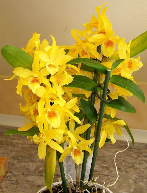 Tak konečně mi rozkvetlo Dendrobium Stardust Firebird aspoň to bylo na štítku u rostliny,jen se mi zdá nějaké bledé,když jsem je loni koupil v květu,byly víc do oranžova,tak nevím čím to.Nebo může ještě ztmavnout?Mrkněte a poraďte,zda mám vůbec to co jsem koupil.