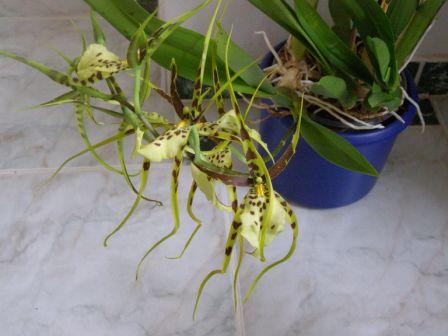 Mě právě rozkvetla Brassia hybrid a Miltonia hybrid (pravděpodobně Miltonia Honolulu Warne´s Best). Má 6 velkých květů a další čtyři květní stvoly na každém jsou 3-4 poupata.
