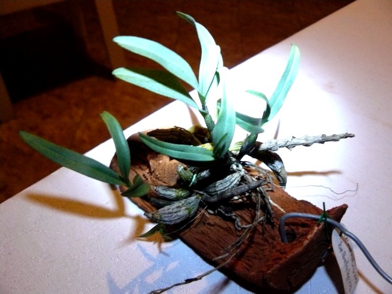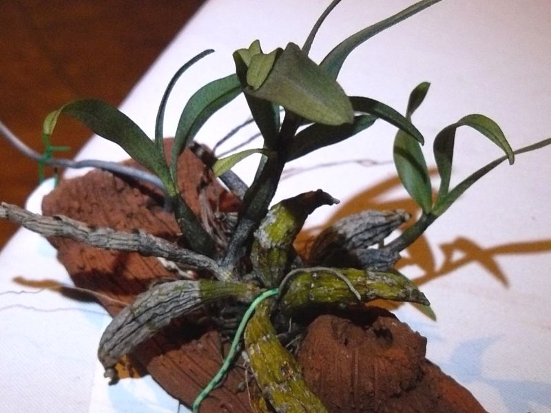 Před několika lety jsem si v Holandsku koupil D. bellatulum. Krásně kvetlo a měl jsem ho vsazeno v mechovém substrátu. Moc jsem se o něj bál a tak jsem jej vlhčil aby nebylo přemokřené ale aby nevyschlo. Najednou nové výhony uhnily a už neobrazilo bylo nenávratně v pánu. Před dvěma lety jsem si koupil nové a protože jsem se dopídil, že naopak potřebuje mezi zálivkami vyschnout všiml jsem si na jedné výstavě, že někdo používá keramiku. Vnuk začal chodit do keramického kroužku, tak mi nadělal závěsy z pálené hlíny. Rostlinu s destičkou prostě na hodinu ponořím do zálivkového roztoku a zavěsím. V létě 3x týdně. Destička velice dobře drží vlhko ale rostlina je přitom suchá. Je jen otázkou, jak dlouho bude trvat zasolení pórů keramiky. Samozřejmě první šlo na destičku D. bellatulum. Krásně vyhání nové výhony, a vypadá velice dobře. Na destičce je již druhým rokem.