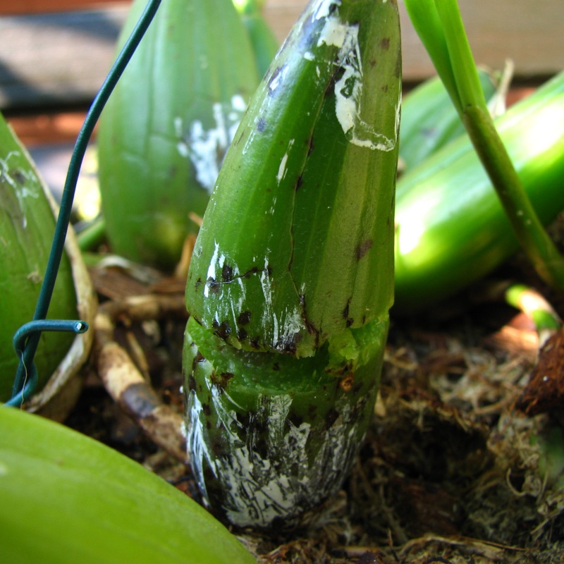 Že by teplotní šok a následně houba? Já všechny Coelogyne včetně teplomilných pěstuju chladněji a ve stínu. S ničím podobným jsem se zatím nesetkal. Jinak ta vaše rostlina nevypadá špatně. To byly chycené jen zadní pahlízy?