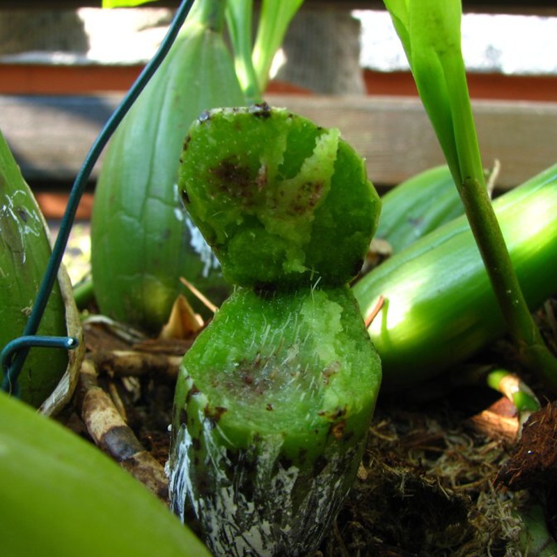 Měla jsem problém (minulé léto) z Coelogyne pandurata v podobě flekatých listů. Po tom marastu zůstala černá pahlíza tu jsem se až dnes rozhodla odstranit (zasažený listy už nejsou na rostlině dávno.)Koukněte co v ní bylo.Měla jsem ji říznout už dávno.Zatím rostou nové nepostižené pahlízky-tak se uvidí.