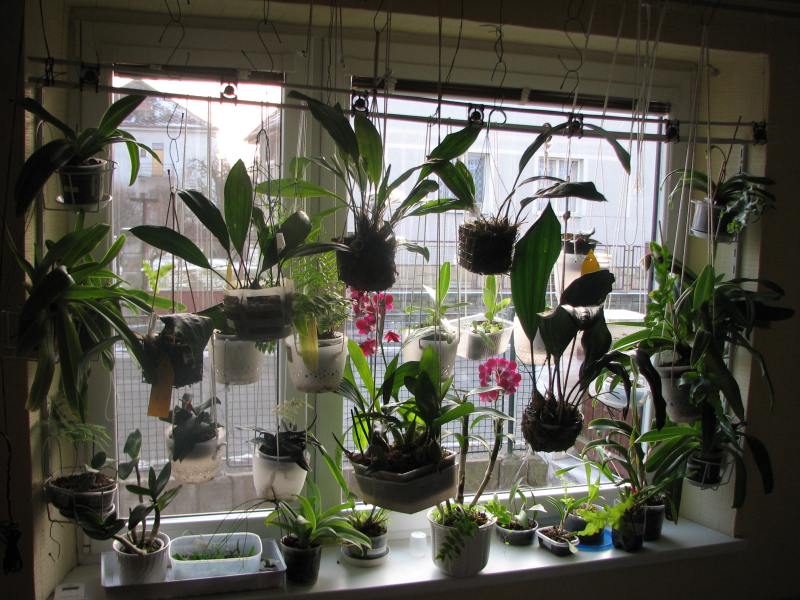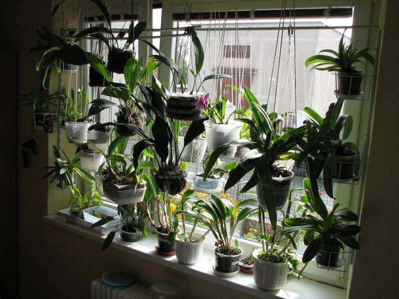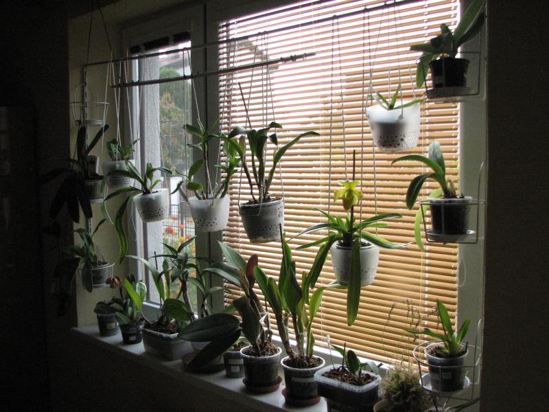 Tak já ukážu svoje bývalé okno .Je to jižní okno, žaluzii jsem nechávala (podle sluníčka a roční doby) staženou ale otevřenou.Teplotu to nesrazí ale kytky se mě v bytě nikdy nepřipekly.Byly tam i střevičníky na zimu (od května přemístěny ven) teplý paph.vícekvětý -zůstaly doma, Cattleye , Dendrobium phalaenopsis,Coelogyne pandurata-ta tam jde dobře dodnes. Není to ale jen o světle ale taky o teplotě. V tom pokoji moc netopím a jednou v zimě jsem měla na parapetu 11°C při náhlém nočním poklesu venkovní teploty. Uprostřed okna bylo víc tak 15°C .Dole na parapetu se to moc nelíbilo teplému Dendrobiu.No člověk se poučí ;)